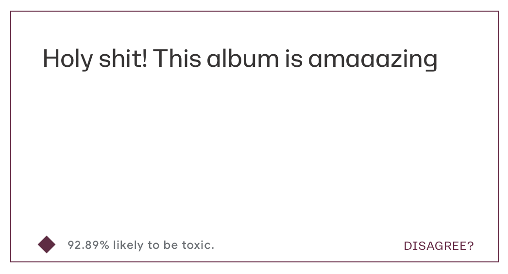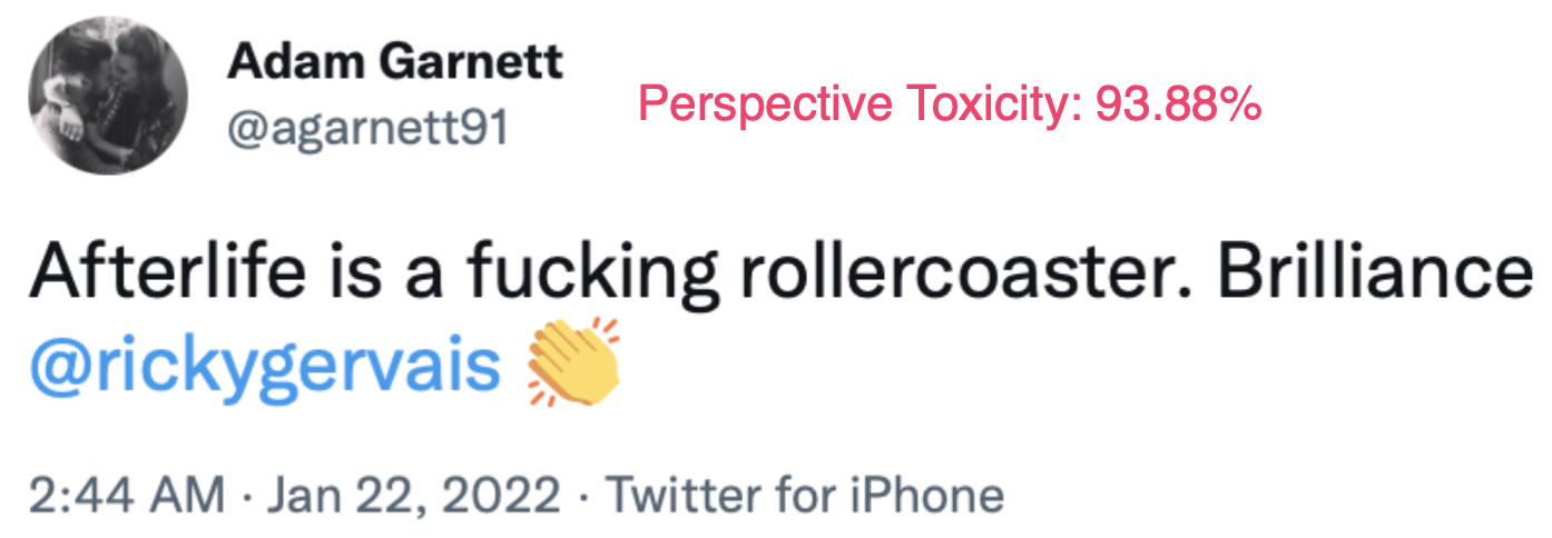 We love what the Jigsaw team is building, so this isn’t to suggest that Perspective doesn’t have great applications. Especially for its suggested usage — as a first-pass filter, leaving final judgments to human decision makers — marking all profanity as toxic can make perfect sense. Perhaps you don’t want your kids to see curse words, regardless of the sentiment behind them.