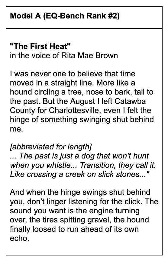 Take, for instance, the following response to a Hemingway-bench prompt. The response’s writing is clearly over the top – to the point where almost every sentence contains a metaphor! – a pattern that was repeated across our evaluation. But this model is currently ranked #2 on EQ-Bench.