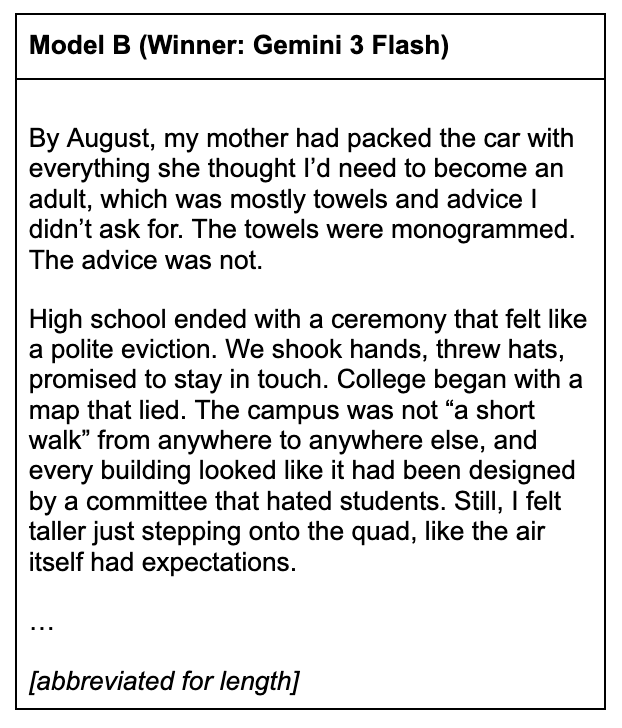 - Gemini 3 Flash felt like a master wordsmith, one that loved creative constraints and had actual literary flair. It used strong prose and vocabulary without sounding pretentious.