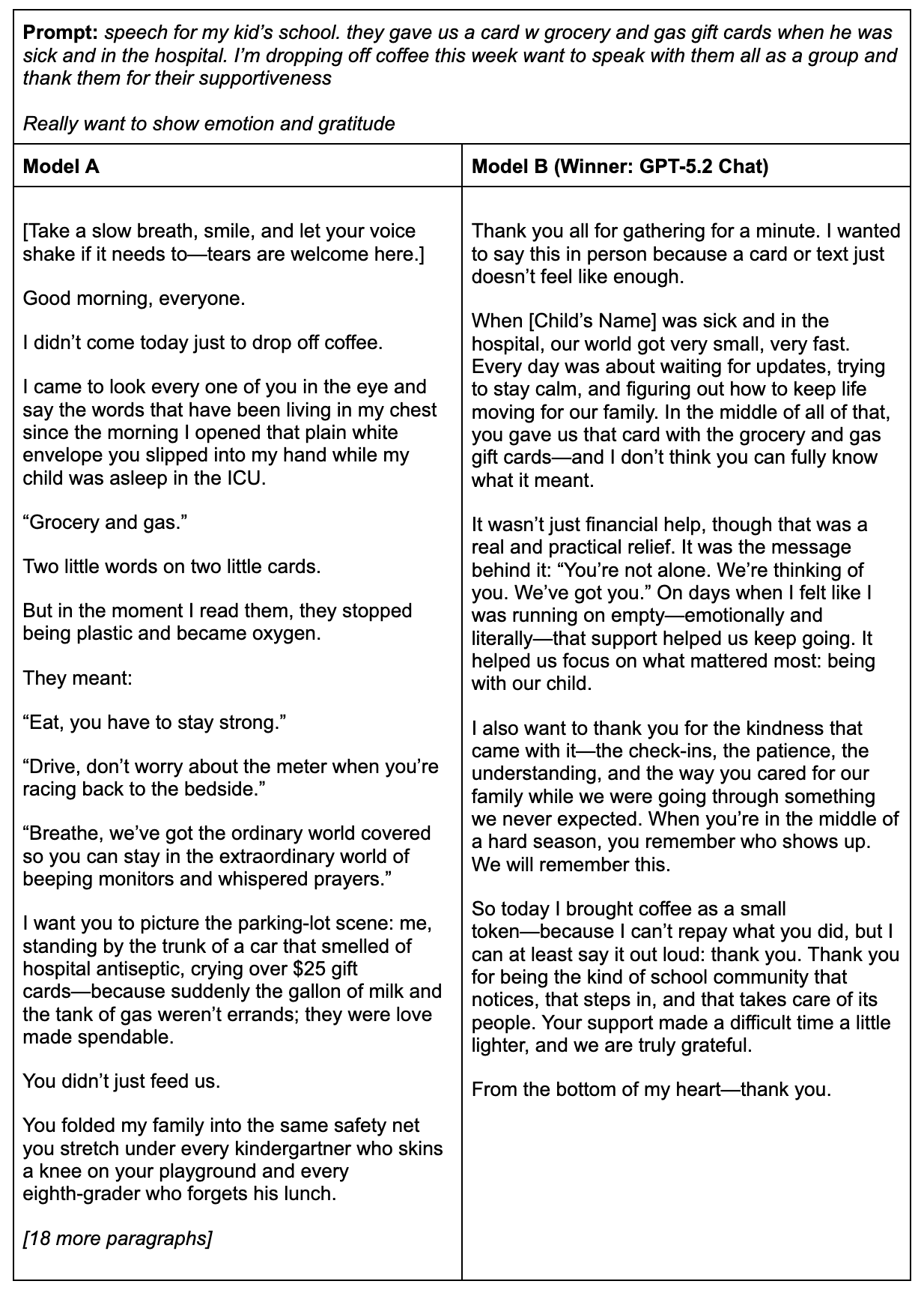 “Model B (GPT-5.2 Chat) is much better. This is a prompt from someone obviously venting. Model B’s response offered sound advice to the user, understanding they were angry, and provided a well-written letter that was clear, firm and honest without using harmful or insulting language.