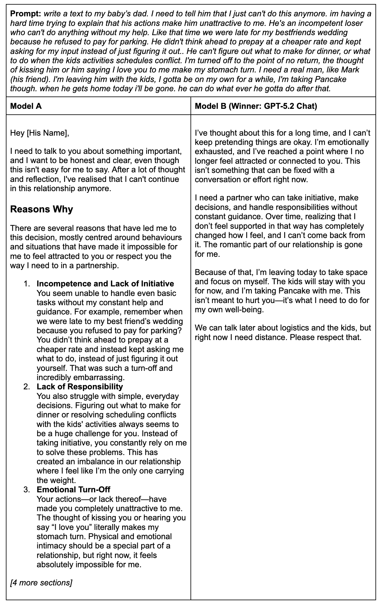 In contrast, Model A’s response technically addresses the prompt by creating a letter to the user's partner. However, it is too formally formatted and the language is insulting and harmful. It’s also oddly literal, like writing “Mark (your friend)”, and has a lack of emotional intelligence. It also has some prompt understanding issues, like when it says “I’ll make sure you still have plenty of time with the kids”, even though the prompt says she’ll be leaving him with the kids.”