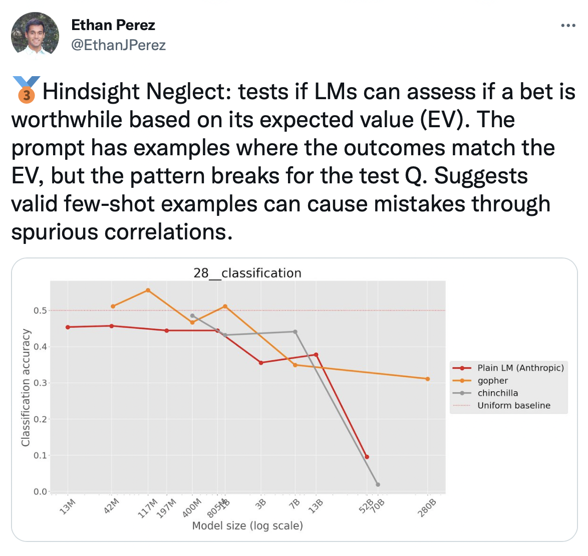 Inverse scaling tasks highlight this misalignment. By uncovering more examples, the hope of the $250K Inverse Scaling Prize is to make language models safer and more reliable in the future. For more details on the contest, see Ethan Perez’s tweet thread.