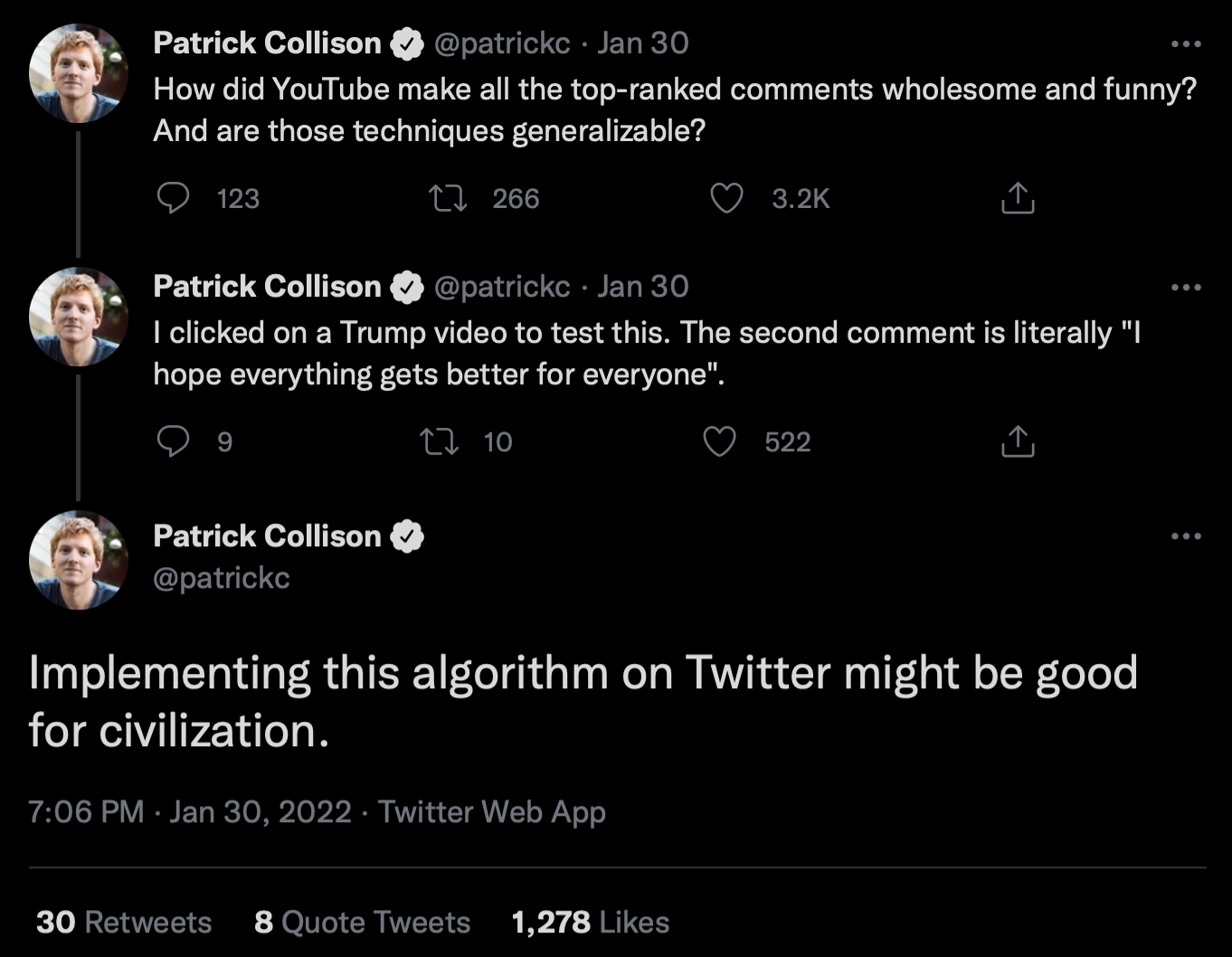 In this world, each social media feed has a principled product objective that it’s optimizing for rather than blindly showing you the type of content you happen to click on the most. What, for example, if YouTube cared about making you smile, even if you spent less time on the site overall?