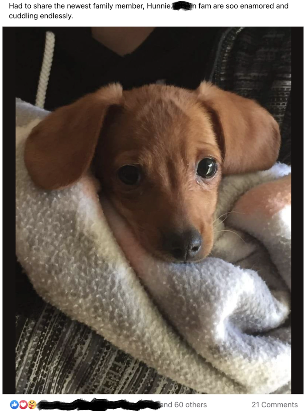 Rating: Amazing. Seeing this post was a pleasant surprise on my feed. This guy is adorable and it cheers me up to see my family friend with a new member to the crew. I love being updated with the different array of pets that they have, and it makes me happy to think about them playing around with this new puppy. I can’t wait to see them next, and the puppy has such pretty eyes and beautiful coloring on its coat, too!