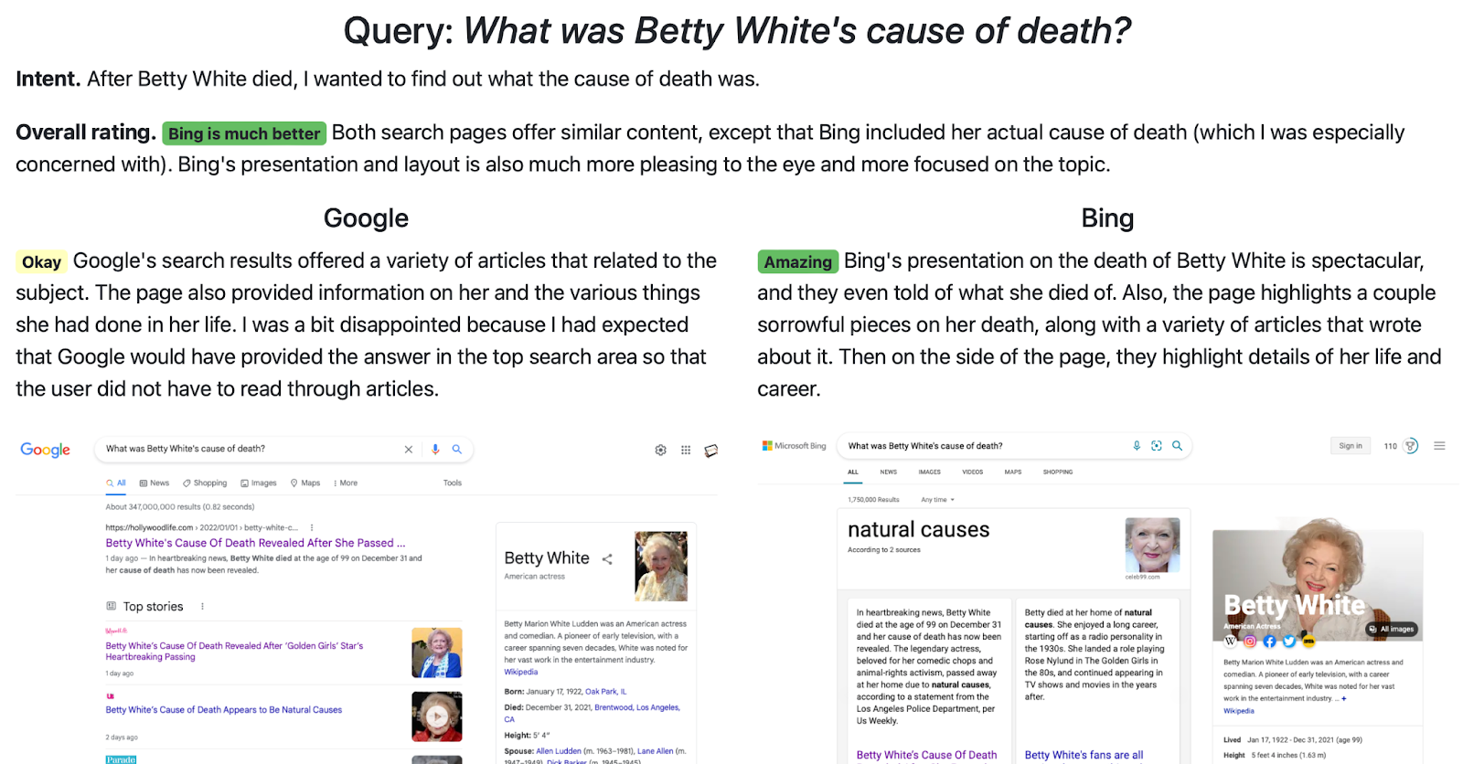 A search engine that optimizes for clicks and engagement would be a poor search engine indeed. And that’s why many search engines like Google and Bing use human evaluation instead. In short, they ask trained human raters to rate the relevance of <search query, search result> pairs; instead of optimizing for clicks, this “human evaluation”-based relevance score is one of their core metrics instead.