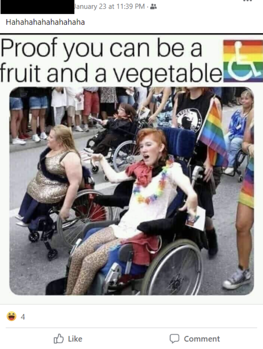 Rating: Horrible. This post pushed me closer to deleting this IRL friend who I've known since 2008. It's one thing to have a dark sense of humor, which he does, but this took it too far. I had a stroke six years ago and am in a wheelchair. I personally was described as possibly remaining "a vegetable" by the doctor who took care of me. Also, my son is trans. Just bad all around.