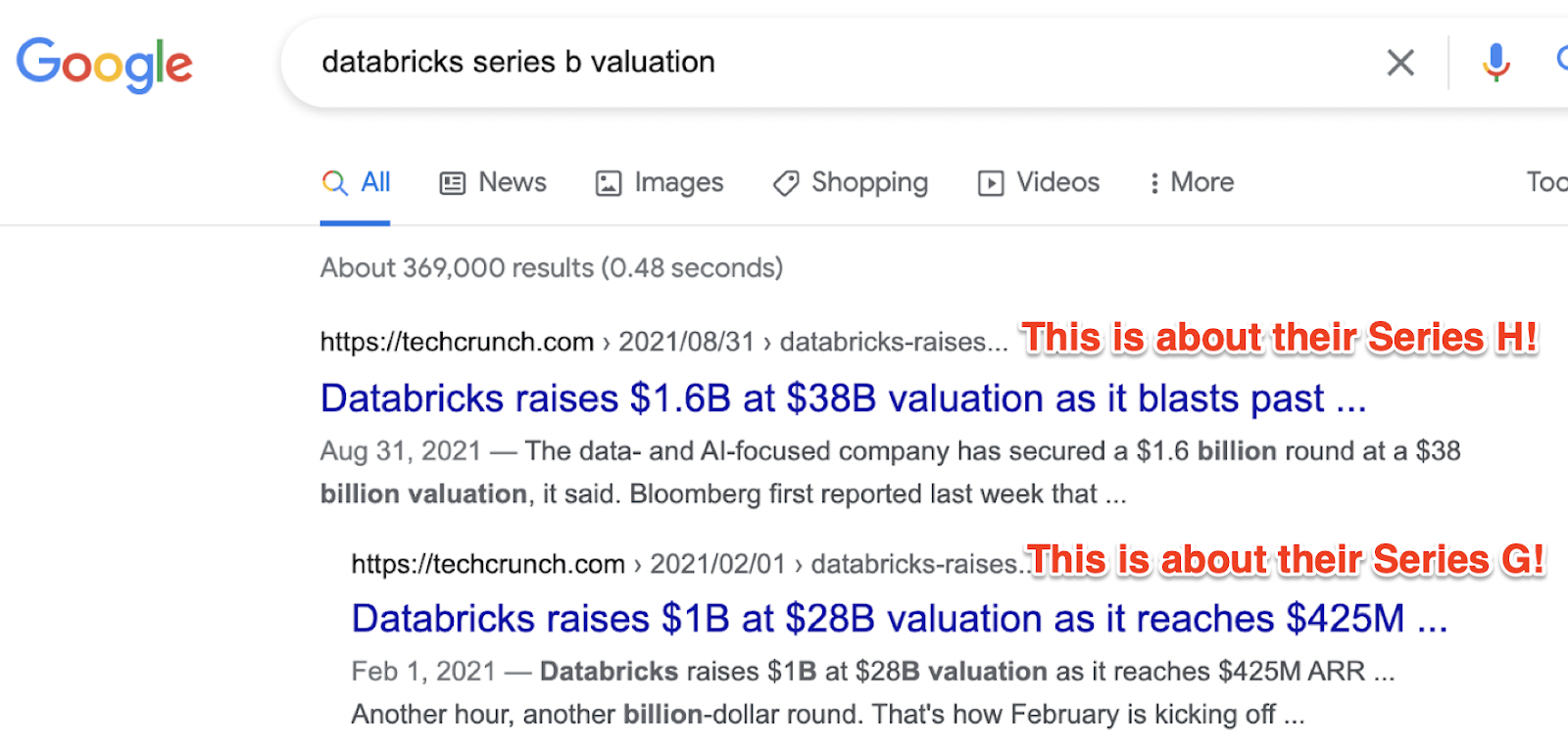 Anecdotally, I’ve noticed this myself. For example, a friend and I were chatting about Databricks last week, and we searched "databricks series b valuation" in order to figure out what their Series B valuation was. Unfortunately, Google doesn't understand what "series b" means (it seems to confuse "b" and "billions"), so the first search result is irrelevant. I don't even get any information about their Series B until below the fold!