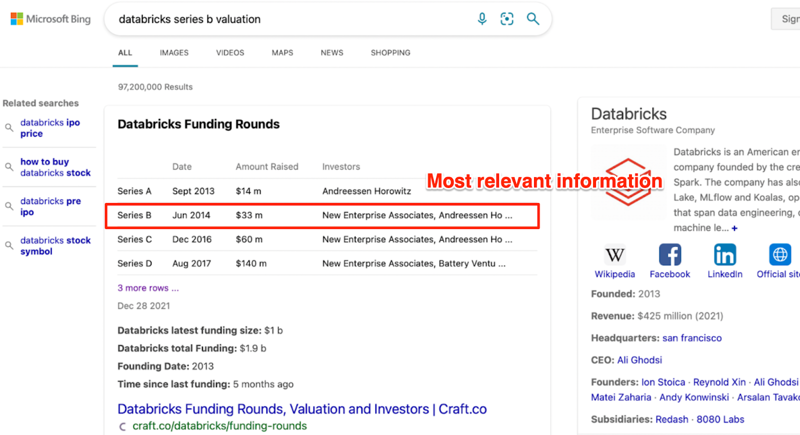 In contrast, Bing's search results page is much better. Information about the Series B is right in the expanded first search result (it doesn’t contain valuation information, but that’s expected because the Series B valuation isn’t public), and the right-hand sidebar is also quite helpful.