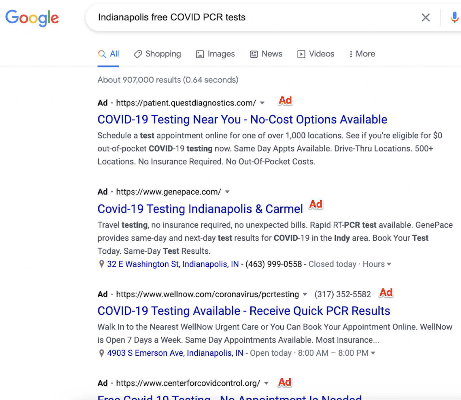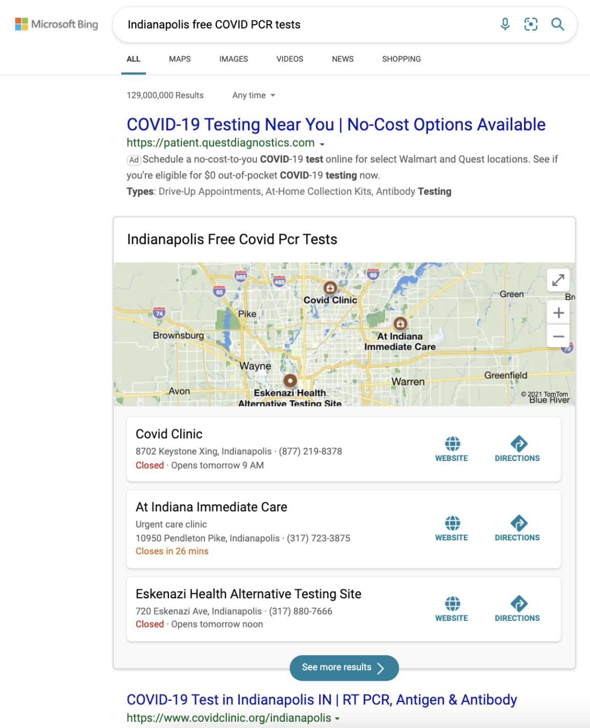 Rater Explanation: I would have liked to have seen the ISDH result sooner than I did in the search results. Or at least a map sooner in the search results of available testing options in the city. Instead, I got a page full of ads.