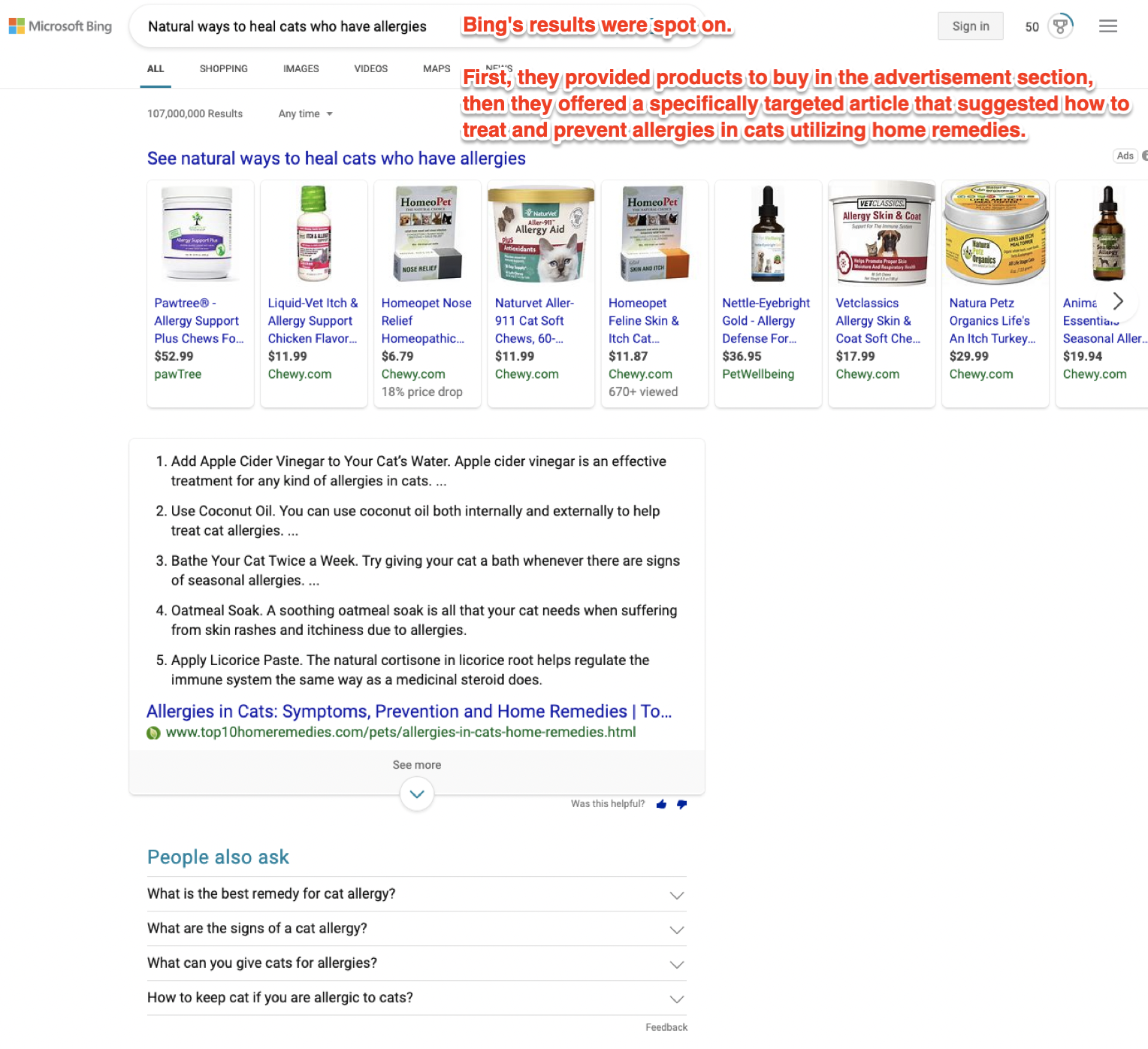 Rater Explanation: Bing's results were spot on. First, they provided products to buy in the advertisement section, then they offered a specifically targeted article that suggested how to treat and prevent allergies in cats utilizing home remedies.