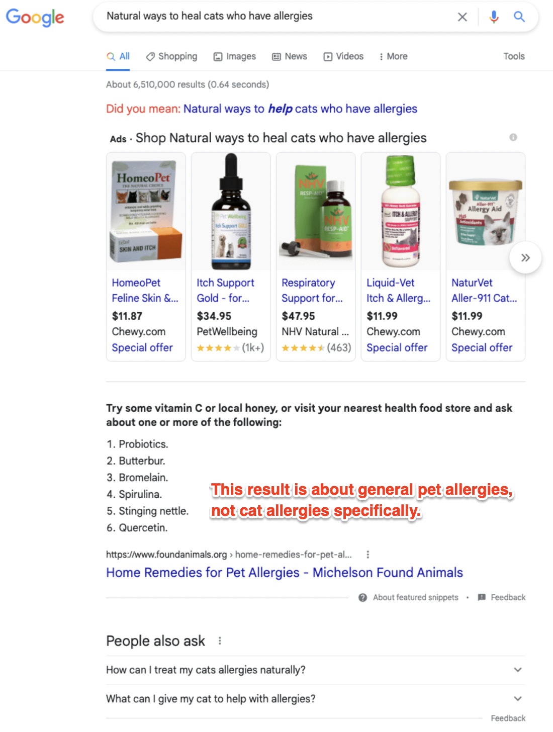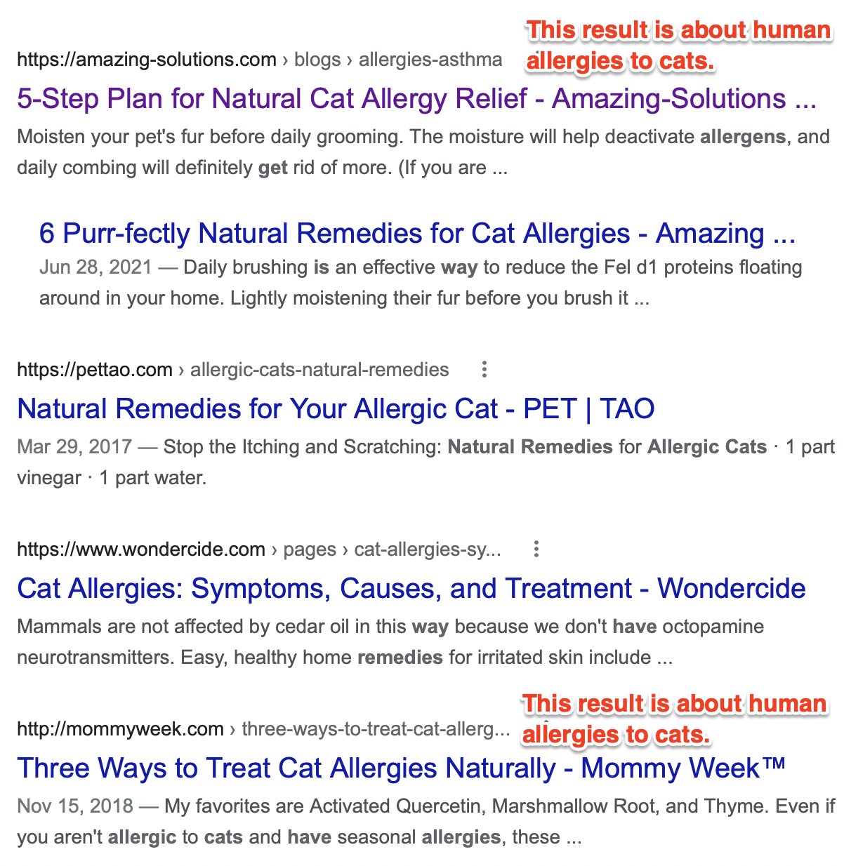 Rater Explanation: The Google results page was not focused on my topic. The results were confused in that half of the content pertained to allergies in cats, and the rest were for general pet allergies or allergies to cats in humans.