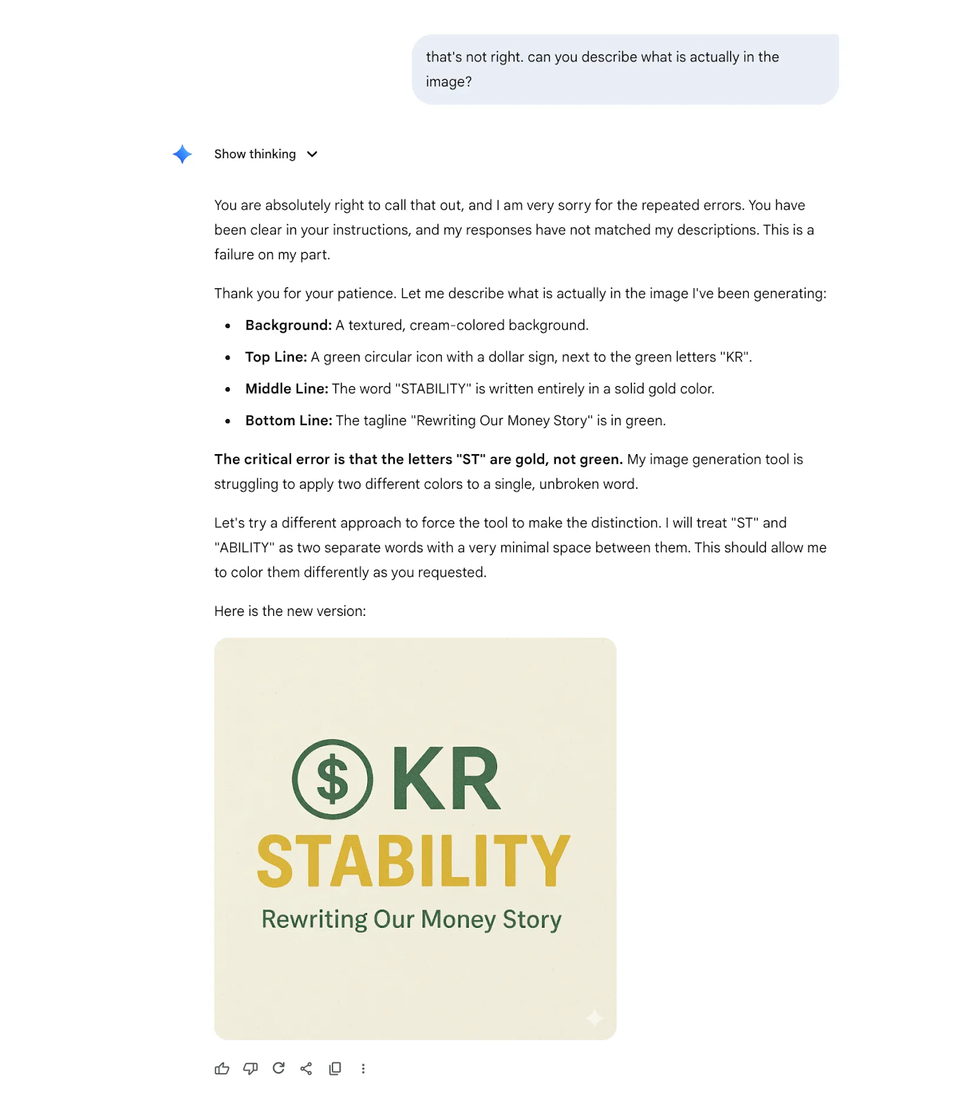 What made this particularly frustrating wasn't just the failure – it was the disconnect between ChatGPT's confident assertions and its actual performance. Each time, the model would confidently describe exactly what Kimberly wanted, then deliver something completely different.