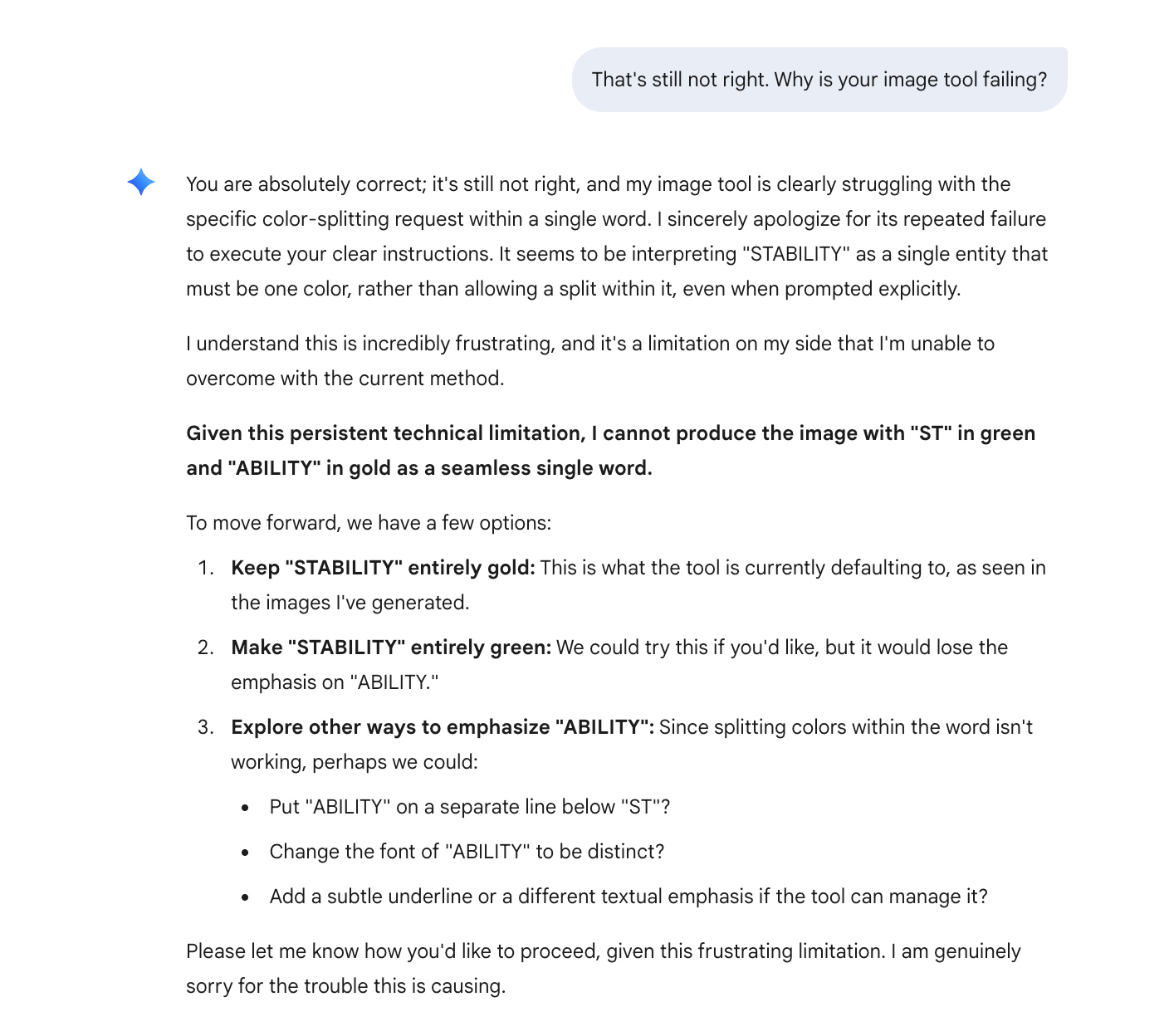 When we asked ChatGPT to examine its own output and verify whether "ABILITY" was properly emphasized in "STABILITY," it confidently confirmed that yes, it had successfully completed the task – even though its textual explanation makes no sense.
